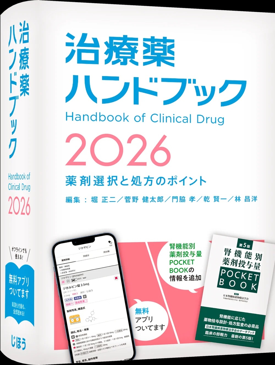 医薬品の腎機能別至適投与量がさっとわかる大好評書籍「腎機能別薬剤投与量POCKET BOOK」の情報が「治療薬ハンドブック2026 」に掲載されます!※